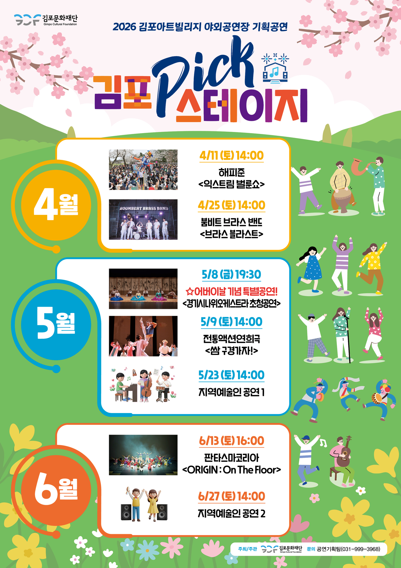 • 5.8.(금) 19:30 어버이날 기념 <김포 PICK 스테이지: 경기시나위오케스트라 초청 공연> 국악 오케스트라의 다채로운 향연이 펼쳐진다. (김포아트빌리지 야외공연장)