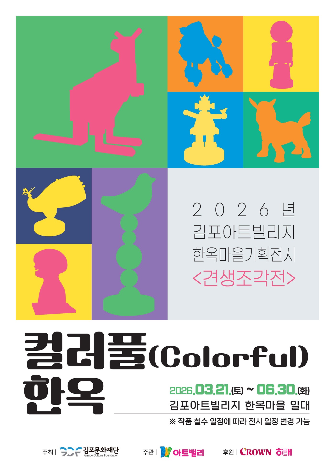 • ~ 6. 30.(화) 김포아트빌리지 한옥마을 기획전시 <견생조각전> ‘컬러풀, 한옥’ 전통 한옥마을에 다채로운 색을 더한 조각 작품을 감상할 수 있는 야외 조각전시전 (김포아트빌리지 한옥마을 일대) ※ 세부 일정은 김포시 및 운영기관 공식 누리집 참고