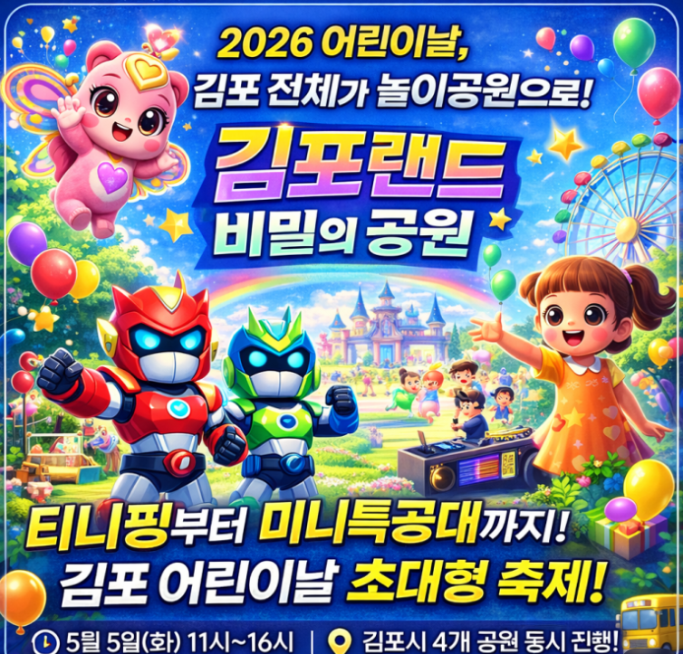 • 5. 5.(화) 김포시 어린이날 문화축제 <김포랜드: 비밀의 공원> 주요 공원 4곳에서 가족 명랑 운동회, 거리 퍼레이드 등 다 채로운 행사가 열린다.(한강신도시호수공원, 한강중앙공원, 걸포중앙공원, 마송중앙공원) ※ 장소별 프로그램 상이
