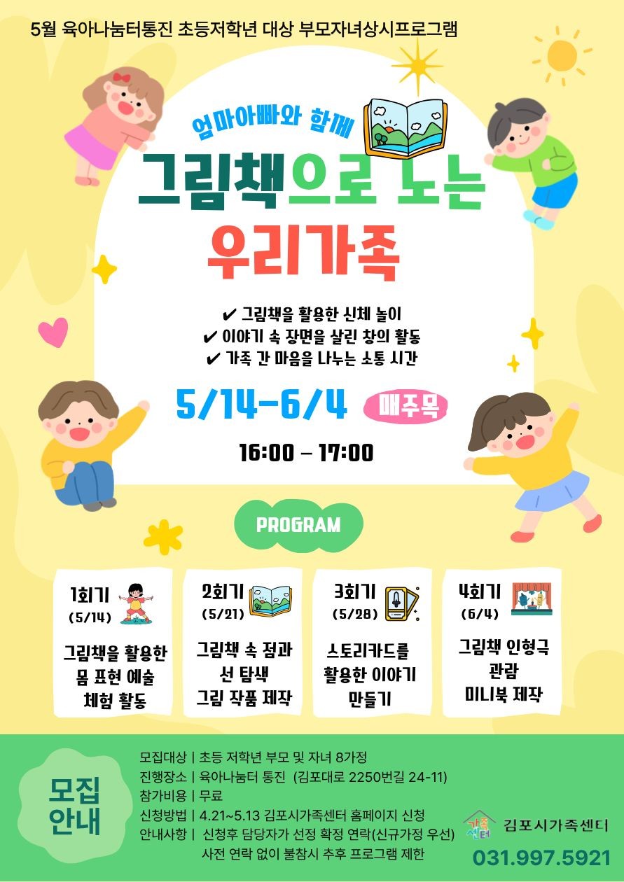 • 5. 14.(목) ~ 6. 4.(목) 그림책으로 노는 우리 가족 그림책을 활용한 신체놀이, 이야기 속 장면을 살린 창의 활동 등을 진행한다. (김포시가족센터 누리집 신청, 육아나눔터통진)