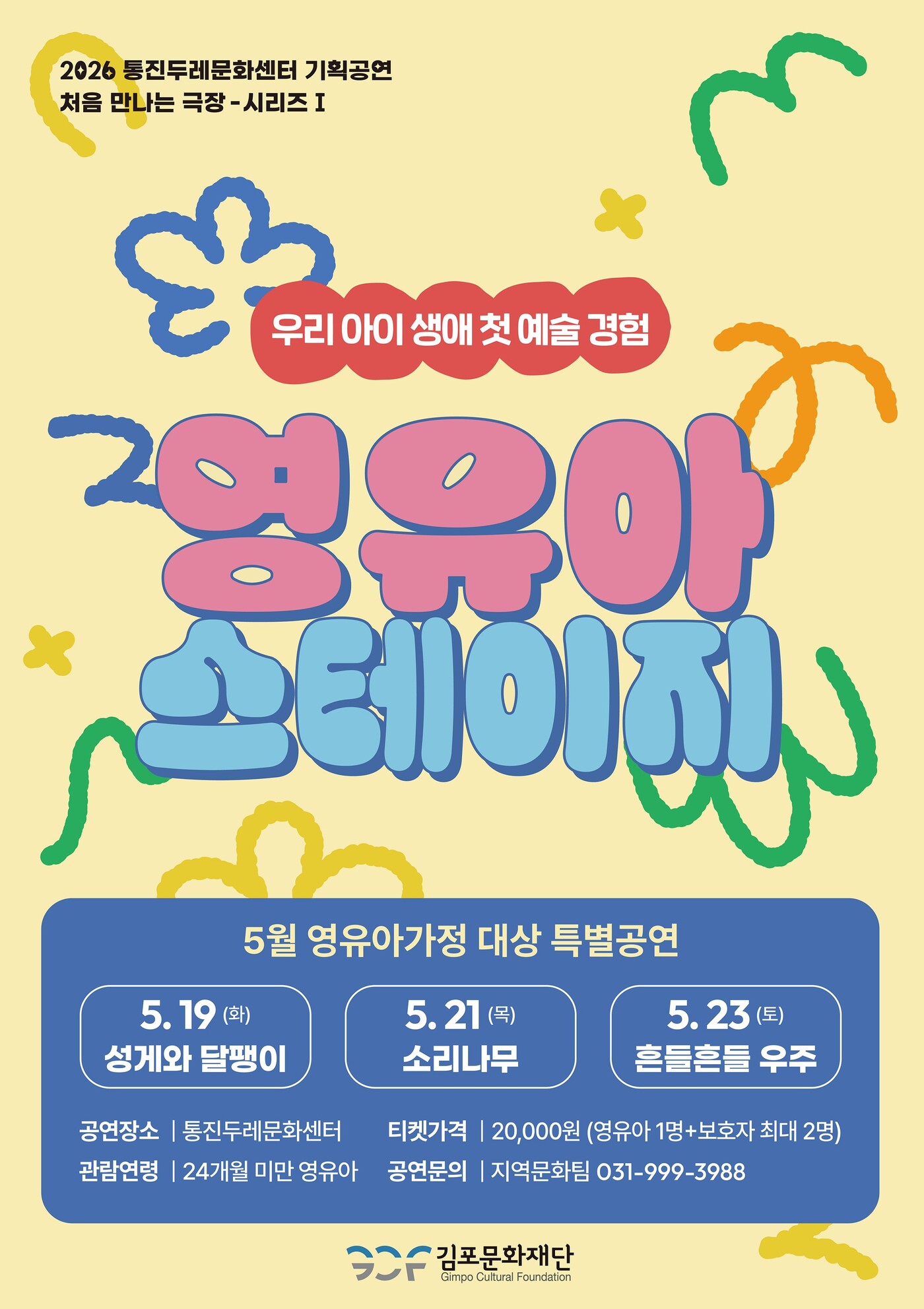 • 5. 19.(화), 5. 21.(목). 5. 23.(토) <처음 만나는 극장 - 영유아 스테이지> 24개월 미만 영유아가 생애 첫 예술 경험을 할 수 있는 전용 공연이다. (통진두레문화센터)