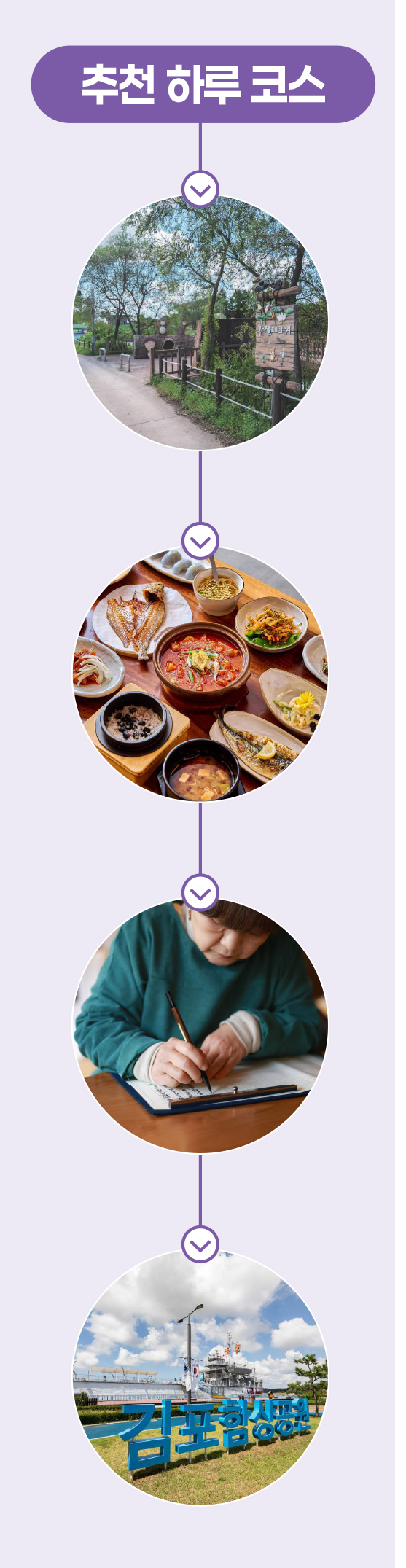 PM 12:00 | 김포금쌀 및 로컬푸드 식단 김포 로컬푸드 직매장 인근이나 대명항 주변의 한정식 전문점에서 김포 특산물인 금쌀로 지은 건강한 식사를 즐겨보자. 제철 식재료를 활용한 균형 잡힌 한 끼가 몸의 활력을 더해준다.